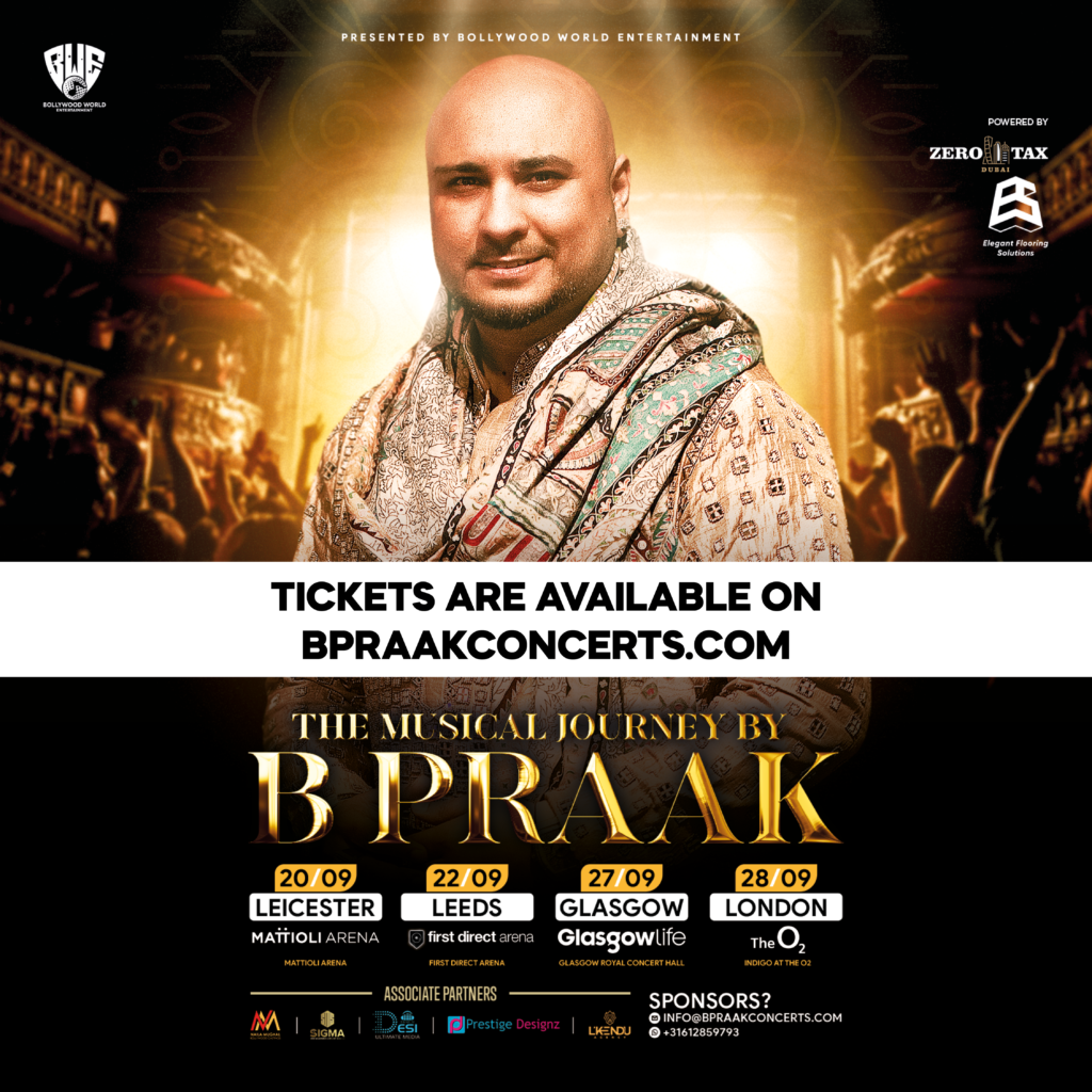 B Praak is een populaire Bollywood zanger en muziekproducent, bekend om zijn diepe, emotionele stem en hits als “Teri Mitti” en “Mann Bharrya.” Hij heeft een grote aanhang, zowel in India als internationaal, en zijn concerten in Engeland trekken duizenden fans. Tijdens zijn optredens brengt hij een mix van soulvolle ballads en energieke nummers, waardoor zijn shows een onvergetelijke ervaring zijn voor liefhebbers van Indiase muziek.